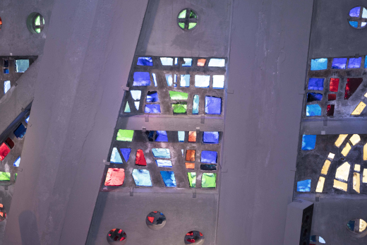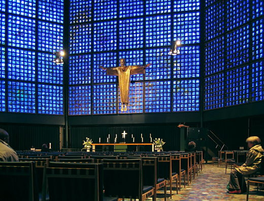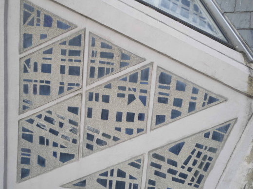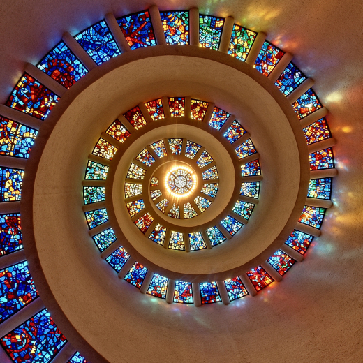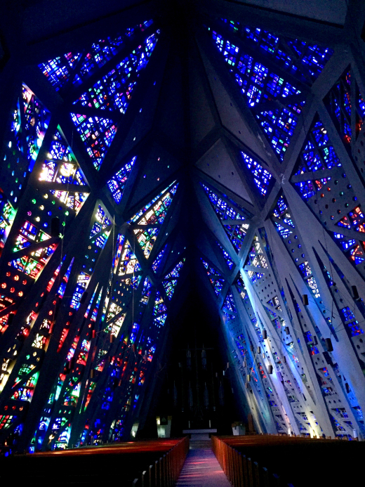 Wallace Harrison came to be regarded as an architect who connected the world of high art with that of a new form of monumental architecture. At the First Presbyterian Church in Stamford, CT, he began with a curiosity about Gothic space as a prototype for the integration of the arts, with the intention of designing a “place of worship with some of the splendor of colored light found in the great Gothic cathedrals.”[2] In 1956, Harrison made the second of two trips to Europe over the course of the First Presbyterian Church commission. He wanted to see examples of Gabriel Loire’s abstract stained glass designs, as he sought inspiration for the colored glass he imagined for the congregation’s new Sanctuary, a structure designed with a Gothic sensibility and modern features. Later reflecting on his accomplishment, he described the visual impression as being inside a giant sapphire.