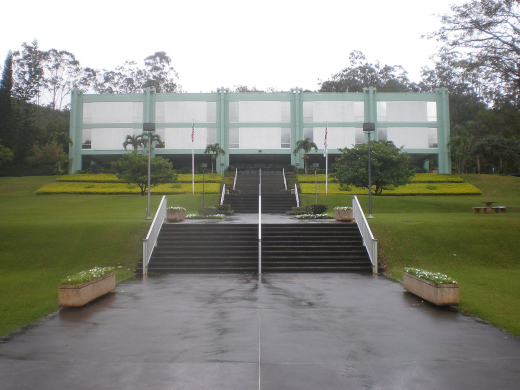 Hawai'i Hochi was designed by Kenzo Tange (1972) for a Japanese newspaper company located in Kalihi, Honolulu. This Brutalist industrial building is the work of a true master of concrete, and the interior courtyard fits well into its tropical climate. It is an oft-forgotten piece of Hawaii's architectural history and is the only building on the list in present danger of disappearing.