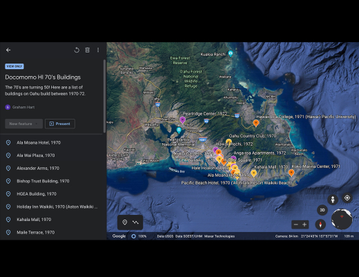 By the 1970s, modern architecture in Hawaii had donned many different garbs. To explore the various ways modernism was interpreted in 1970s Hawaii, the chapter has created a Google Earth map of sites in Oahu dating from 1970-72.