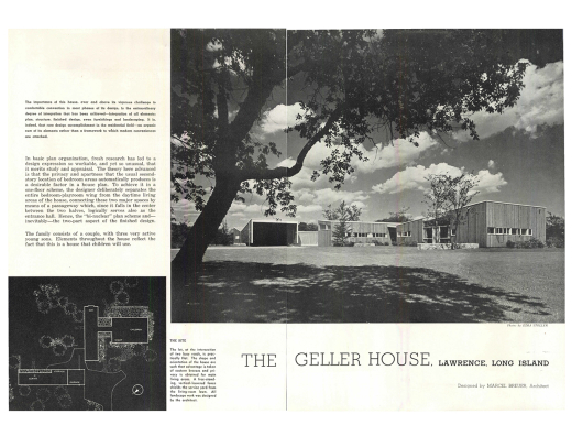 In 1945, Marcel Breuer designed a revolutionary house for Bertram and Phyllis Geller built in Lawrence, New York, a newly developing suburb just outside New York City. Described as a “tour de force”, The Geller house was pivotal from the moment it was completed. It is Marcel Breuer’s first completed “binuclear” house design where living and sleeping areas are separated into two different formal elements.