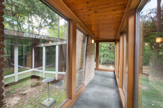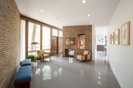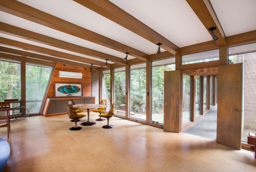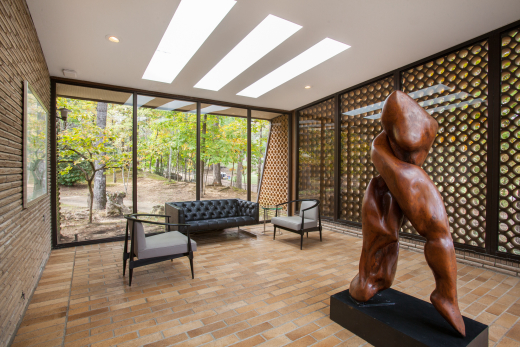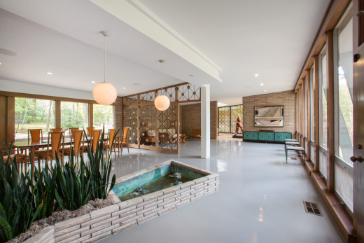 W.W. Easley II was, at 27, the architect of the Falk House, and would finish the major enclosures, additions, and Japanese gardens surrounding the home over the next 20 years. “One of my favorite things about the house is the design philosophy serving as the home’s spiritual engine,” says Hooks. “In the Falk House, Easley achieved a careful balance between the two competing philosophies of modern design of the 1950s and 1960s. On the one hand, there were the organic modernists typified by Frank Lloyd Wright and his disciples. On the other hand, there were the streamlined, glass-and-steel architects represented by Philip Johnson, Mies van Der Rohe, and others. Easley set out to balance the two camps in one structure, a revolutionary act for any architect. The result is a warm form of modernism that I believe most of the great modernist architects would be very pleased with. You can see the same roof pitches, for example, at Wright’s Taliesin West compound in Scottsdale. The home’s relationship to its natural surroundings is another hallmark of the modernist architects who followed the organic design principles. But the floor-to-ceiling walls of glass belong to Johnson and Mies. Over half of all exterior walls are floor-to-ceiling glass, allowing abundant, natural light almost everywhere inside.”
