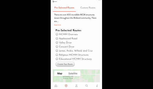 Tours are an added featured offered in the app. Users can choose to take a predetermined route or create a customized tour by selecting the architect and or building type. The app will then route your tour in the most efficient path and send it to Google Maps. The routing feature was created through a partnership with the University of Michigan’s Department of Industrial Operation Engineering Practicum in Production and Service System Class.