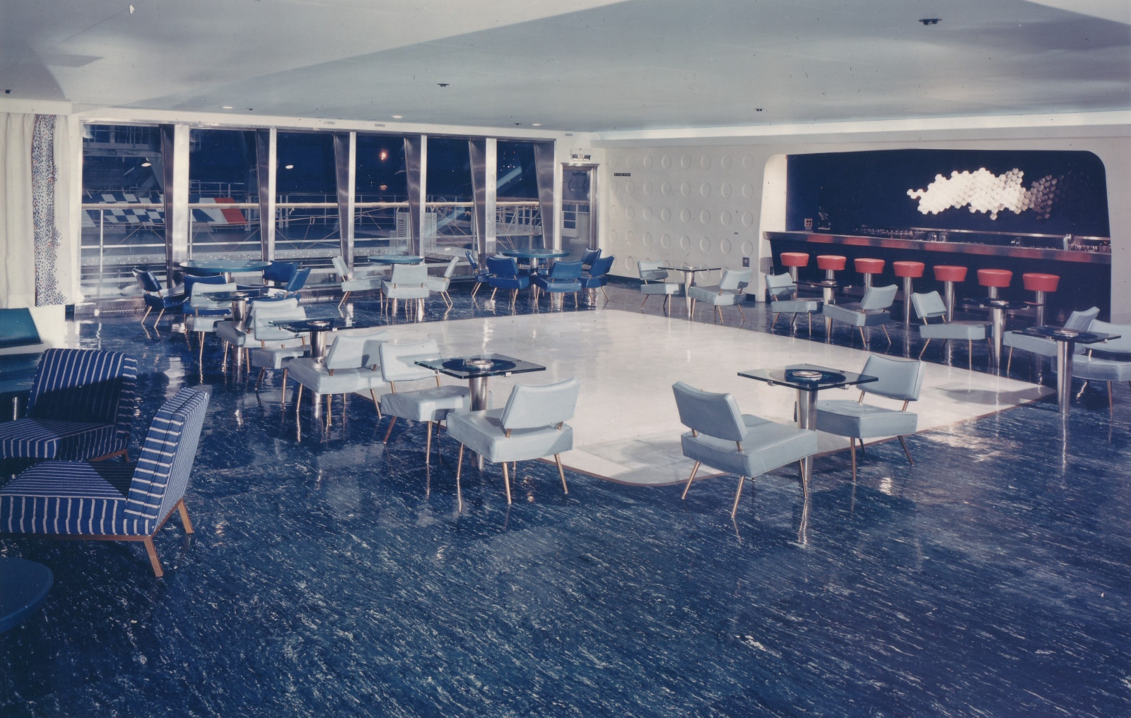 Modern artwork also played a key role in the ship’s aesthetics; both permanent and loaned displays of artwork were showcased. Of the permanent displays, perhaps the most prominent is the “Fission” hyperboloid mural by Pierre Bourdelle, located in the Dining Room behind the captain’s table, and it and remains on the ship today. Original prints, etchings, woodcuts, abstract color photography, and ceramics hung in passenger and officers’ staterooms. The Whitney Museum of American Art loaned fourteen paintings which were displayed in the main lounge for passengers and visitors to enjoy.