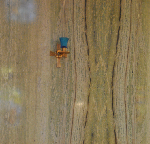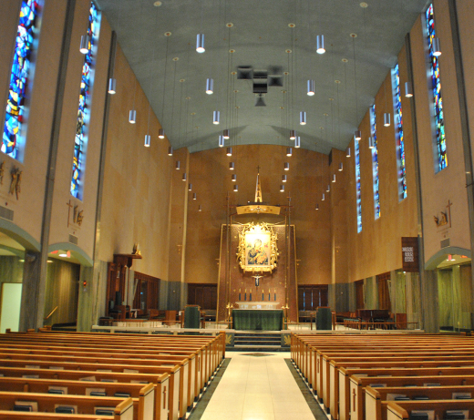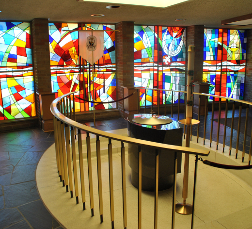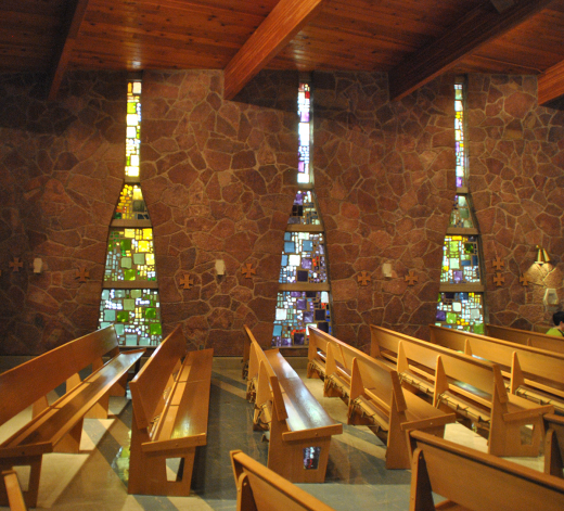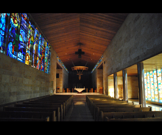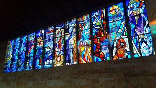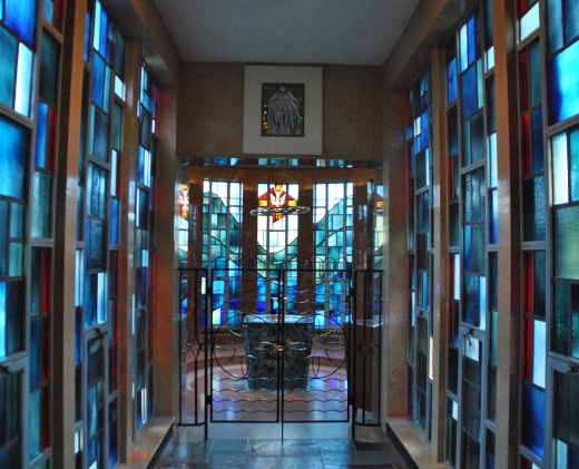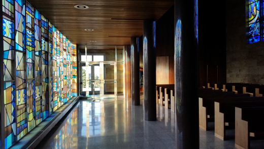 Stained glass around the building is found in a beautiful variety. Seven columns of square tiles of primary-colored faceted glass in a starburst pattern, set in concrete bedding in a grid frame of limestone, makes up a large window on the east façade, at the rear of the sanctuary. Leaded stained-glass windows run along the north and south walls of the sanctuary. They depict biblical scenes and church figures amid swirling geometric backgrounds. Off the south end of the narthex, nearly the full height of the walls leading to and surrounding the circular baptistery (18-ft. diameter) are comprised of leaded stained glass window panels in a variety of solid blue, green, and red hues. At the central part of the Baptistery, a panel of glass in the baptistery depicts a dove and flame. The glass throughout the Baptistery provides incredible atmosphere to the space and reflects the symbolism of water and Spirit meeting in the sacrament of Baptism.