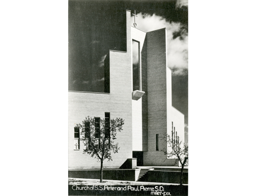 Sts. Peter and Paul in Pierre, built in 1940 from a design by Barry Byrne (Chicago); St. Mary’s in Sioux Falls, built in 1958 from a design by Harold Spitznagel (Sioux Falls SD);