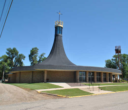 Christ the King church in Webster, designed in 1966 by Ralph Koch (Sioux Falls) with a circular sanctuary to evoke biblical tents;