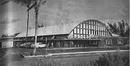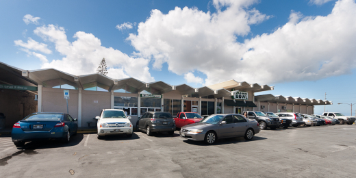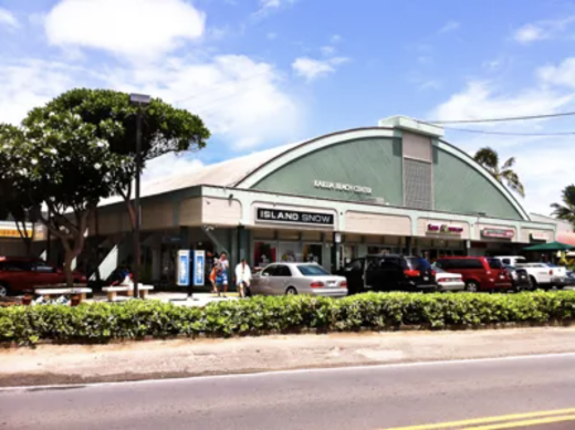 The Kailua Beach Shopping Center was designed by architects Wimberly and Cook and constructed in 1955. At its facade, load-bearing grilles with blue heat-absorbing glass have been replaced in favor of wood siding and a boxy, built-out overhang that provides shade for the multiple storefronts below. The overhang also conceals a portion of the precast concrete abutments flanking each side of the 90-foot clear span roof, which were exposed to showcase the elegant structural ingenuity of the original design and engineering. The original brick veneer liquor store which once stood adjacent to the supermarket entryway has since been demolished, and additional parking now stands in its place.