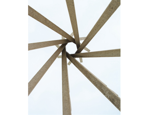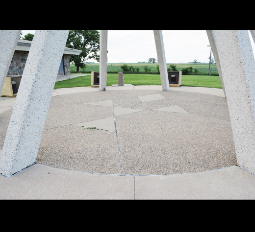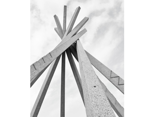 In 1965, Whitwam started work on the set of structures that have become a recognizable part of the South Dakota landscape. Tourism has had a tremendous impact on South Dakota since the 1930s, and a great number of those tourists travel by car. The first segment of interstate highway in South Dakota opened in 1960 at the Minnesota border and construction continued until completing the last segment in 1983. The Highway Beautification Act of 1965, spearheaded by first lady “Lady Bird” Johnson, made federal resources available to the South Dakota Department of Transportation (SDDOT) to design and build rest areas along its two new interstate highways. SDDOT’s director John E. Olson invited Whitwam to submit a design proposal for the rest area to the State Highway Commission. His original concept included concrete tipis at the center of a semi-circular building below-grade, representing both indigenous tribes’ earth mound and lodgepole tipi dwellings and the dugouts that some early Euro-American settlers built. Although the building design changed before implementation, and most of the facility buildings have been since re-designed, the concrete tipis were built and remain. The first four tipis were put up in 1968 at rest areas by Wasta and Salem. A success with tourists, the SDDOT added tipis to five additional rest area locations and were completed from 1973 to 1979. The eight concrete poles, precast in Sioux Falls, were 40 feet long (at first, later 56 feet), rectilinear with chamfered edges, and connected at the top with welded steel plates. The poles and concrete base were incised with isosceles triangles to create thunderbird patterns and spotlights were installed in boxes just off the base of each pole. Whitwam worked with Wilfred Schroeder, Marvin Heck, and Richard Heck of Gage Brothers Concrete in Sioux Falls to determine how to cast, position, and connect the poles, which were put up by resting on a temporary central support until they could be welded together. Whitwam’s concrete tipis are part of the roadside landscape of the U.S. but are also works of art—"a design solution as potent in its clarity as it is in elegant simplicity.”(4) The Federal Highways Administration has recognized the tipi sculptures as a historically significant component of the interstate system in South Dakota, and they were listed in the National Register of Historic Places in January 2015.