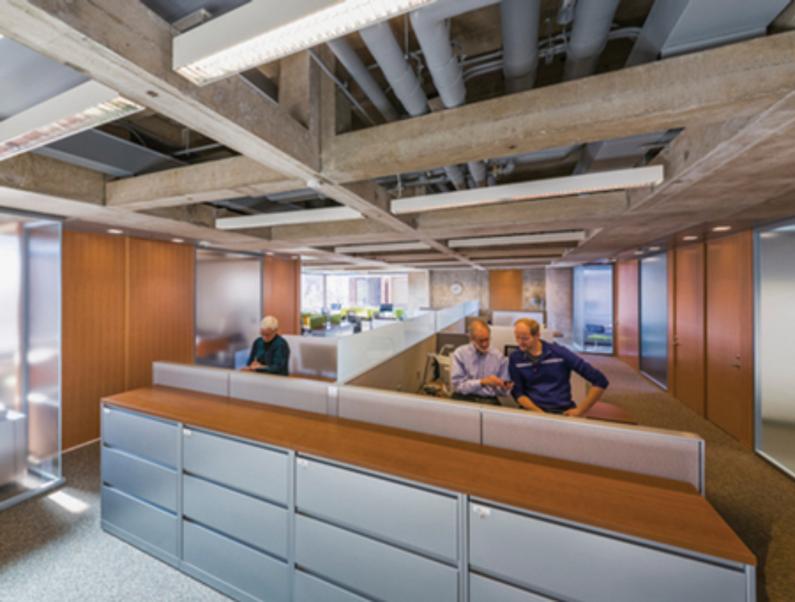 New lighting fixtures and chilled beam units in a corner bay (Copyright 2015- Esto Photographers, Ryan Rotham)