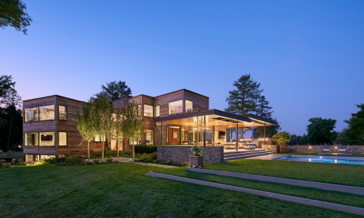 A Residential Design Citation of Merit is given for the restoration of Birch Knoll, designed by Philadelphia architect George Daub in 1949. Initially built for the President of Aronomink Golf Course, Birch Knoll occupies a picturesque spot alongside the 14th and 15th holes, showcasing its International Style design with panoramic views through expansive windows and an asymmetrical layout, blending glass, steel, stone, and wood. After years of neglect following a 2011 renovation, Birch Knoll found new custodians in 2017 who aimed to restore its original Midcentury Modern appeal. Lacking original drawings, in-depth research and selective demolition were conducted to ensure design interventions aligned with Daub's vision. The building envelope was a significant challenge, necessitating a complete overhaul to prevent water infiltration and restore the natural wood finish. The use of natural stone, walnut millwork, and faithful replication of original elements helped address material inconsistencies. Technological advancements were integrated without compromising the design intent. Birch Knoll's restoration ensures the residence remains a timeless and comfortable family home, ready for 21st-century living.
